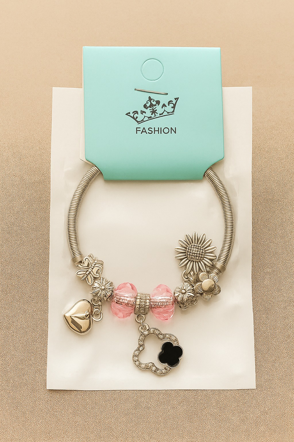 Stylish and trendy silver-tone charm bracelet featuring floral designs, heart charm, and sparkling pink crystal beads. Highlighted with a hanging clover-shaped pendant, this bracelet is perfect for casual wear, gifting, or adding a chic touch to any outfit. A fashionable accessory for women and girls who love playful elegant