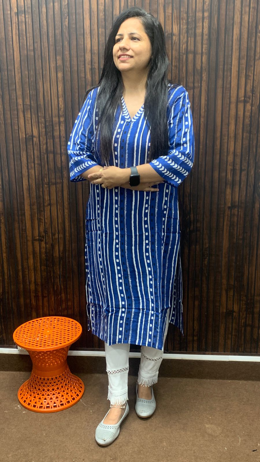 Women’s Blue Striped Printed Straight Kurta with V-Neck & 3/4 Sleeves | Casual & Office Wear |