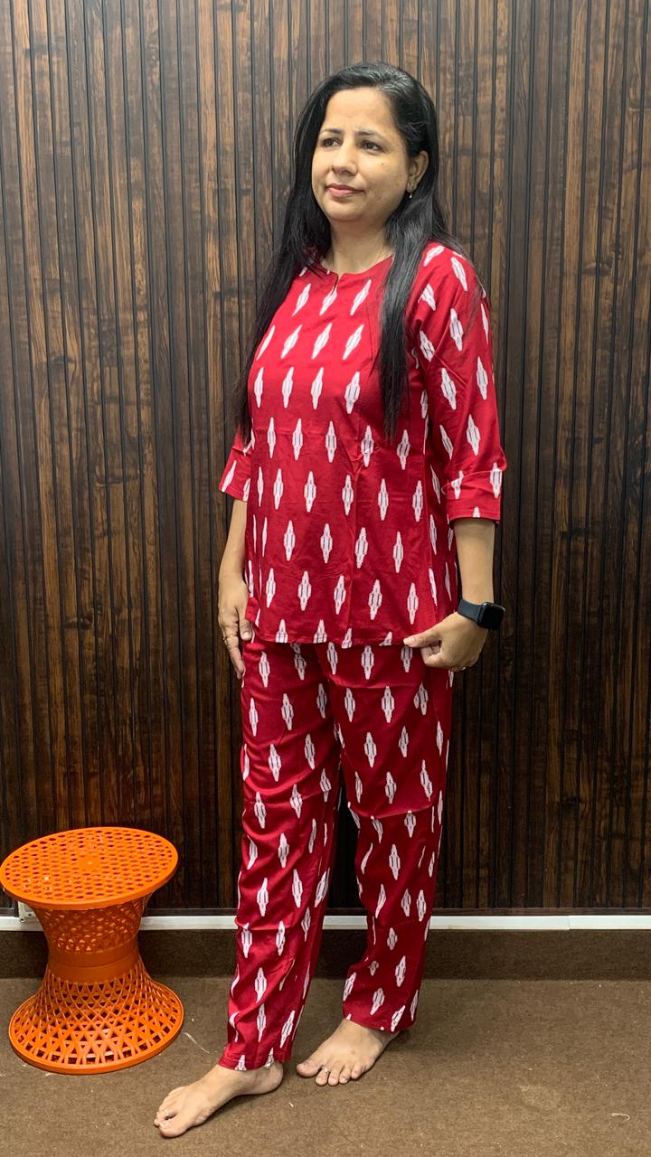 Women’s Cotton Printed Night Suit Set | Red Ikat Design | Comfortable Loungewear & Nightwear