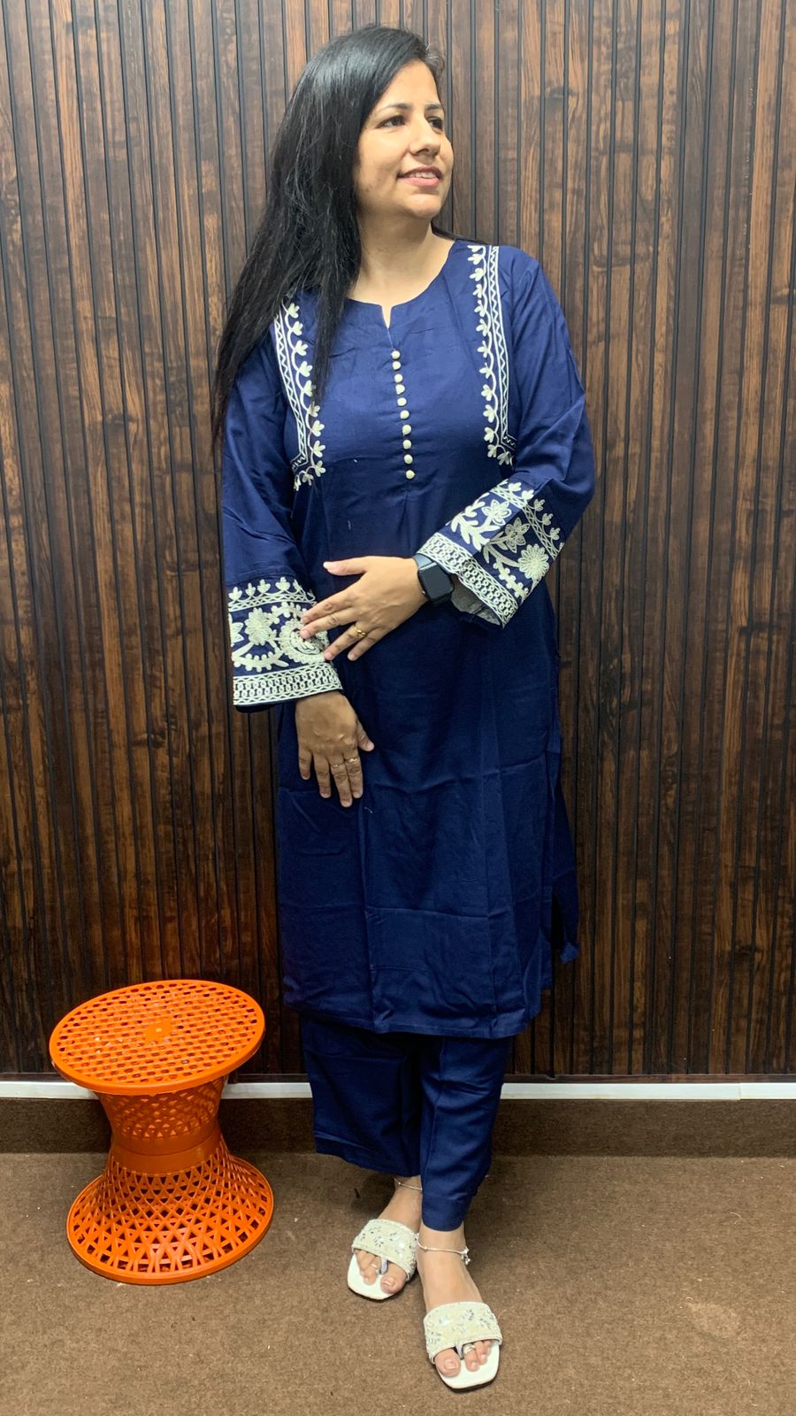 Women's Cotton Straight Kurta Set with Embroidered Detailing | Navy Blue Ethnic Kurta with Pants Product Description: